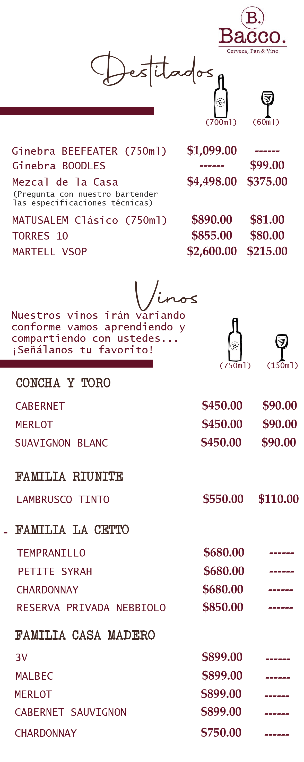 Menú Bacco Bebidas